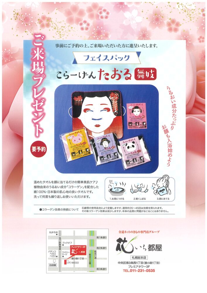 事前に御来場予約を頂いた方には、「フェイスパックこらーげんたおる【舞妓】」をプレゼントいたします!