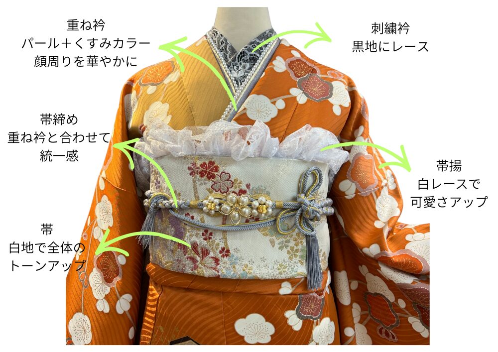 | 帯締(おびじめ)・帯揚(おびあげ) | レース、パール、房飾(ふさかざ)りなどの異素材(いそざい)を大胆(だいたん)に取り入れることで、一気に華やかさと抜け感を演出。特にパール付きの帯締は、現代のガーリー・モダンな振袖コーデには欠かせません。帯揚は、ボリュームを抑えたレース素材で軽さを出します。 |