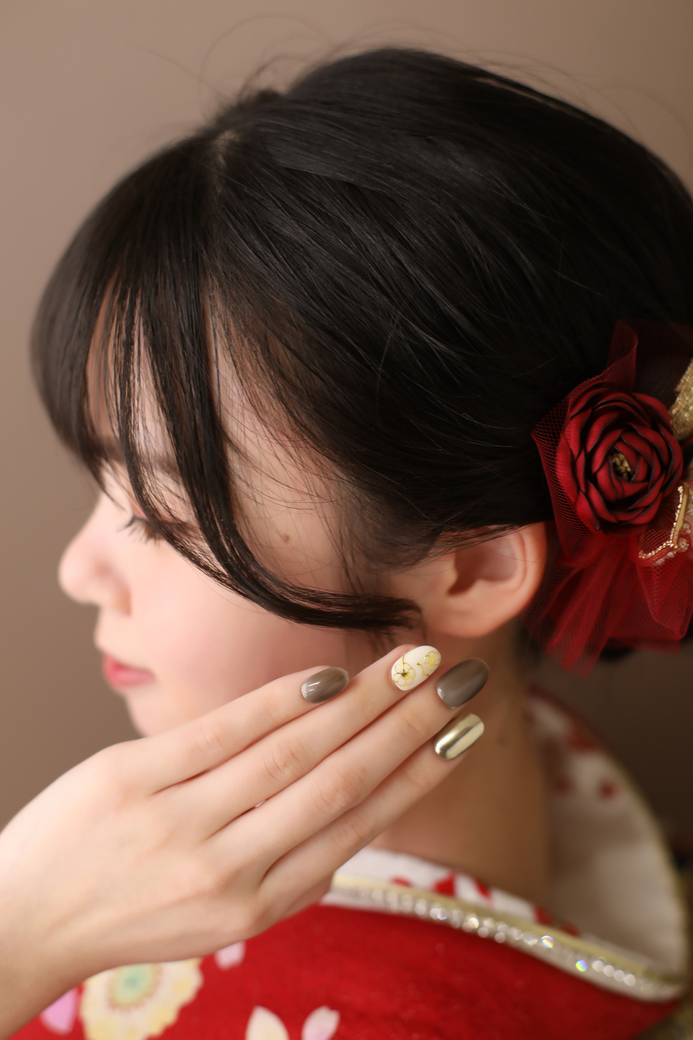 華やかな赤い振袖に合わせてるのは、落ち着いたブラウン系のネイル!