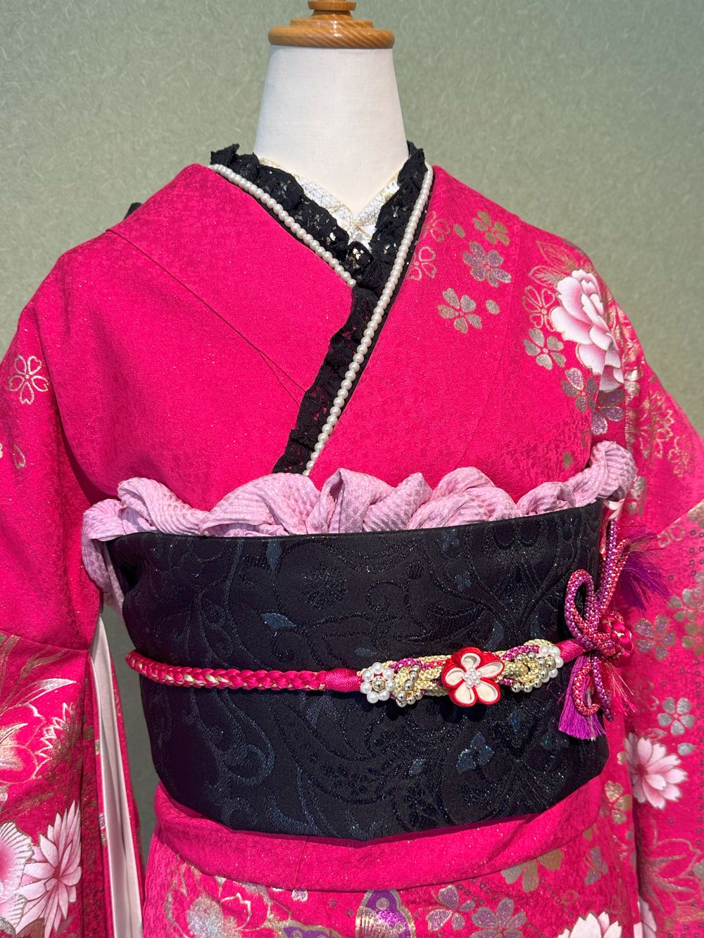 重ね衿は帯と同じ黒レースを使用しました!よく見るとパールもついていて華やかですよね(^^♪
