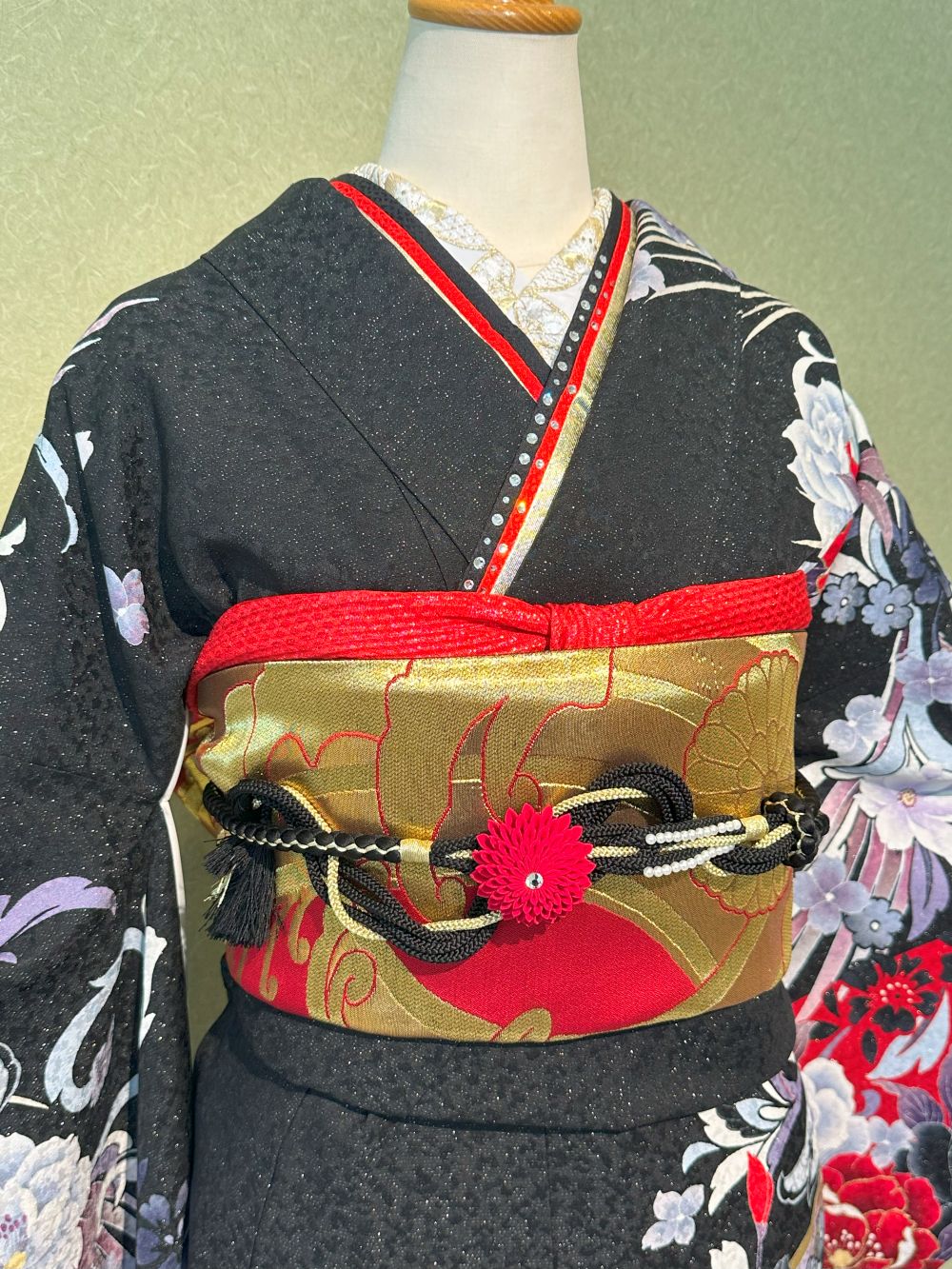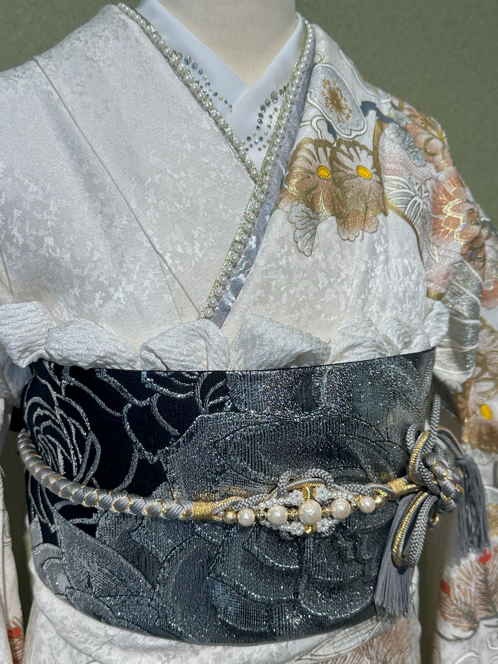 帯は黒とシルバーでメリハリを!柄はバラで華やかなイメージに!