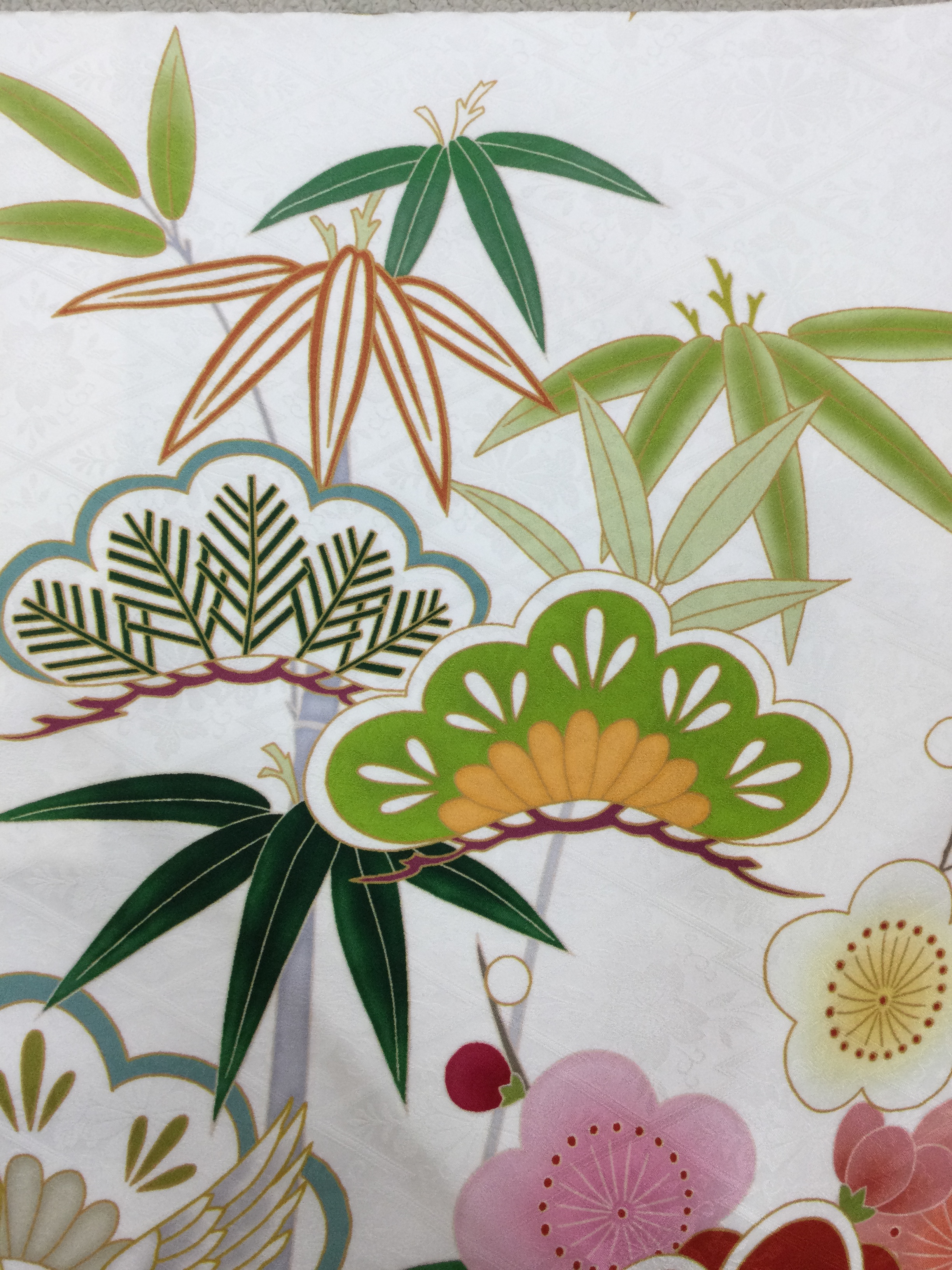 一年中緑を保つ松は、「不老長寿(ふろうちょうじゅ)」や「永遠の若さ」を表す縁起(えんぎ)のいいモチーフ。