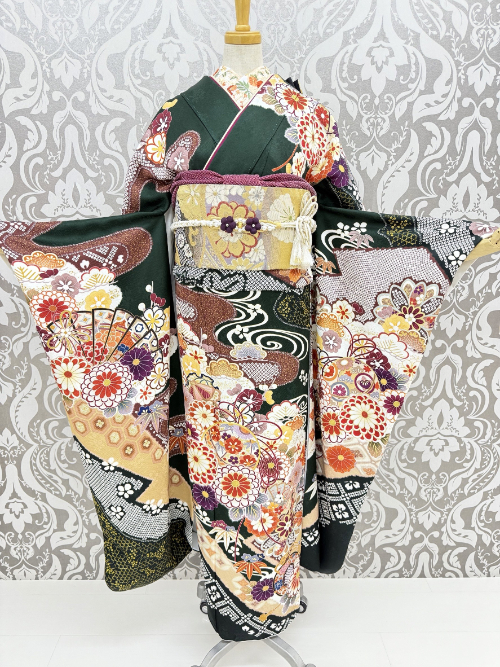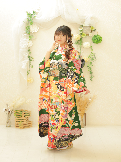 鮮やかなエメラルドグリーンから深いモスグリーンまでバリエーション豊か。緑の振袖は、古典柄とも相性が良く、特に金色の刺繍や差し色を加えることで高級感が引き立ちます。上品かつ個性的な印象を与えたいお嬢様におすすめです。