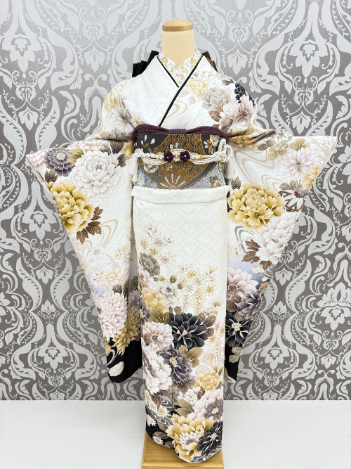 白地の振袖(ふりそで)は、一見シンプルに思えますが、柄の選び方や帯との組み合わせで印象がガラリと変わります。金や銀の刺繍(ししゅう)が施されたものは豪華で格式(かくしき)高い印象に。近年は、くすみカラーやパステル調の小物と組み合わせて、ナチュラルかつ現代的なスタイルが注目されています。