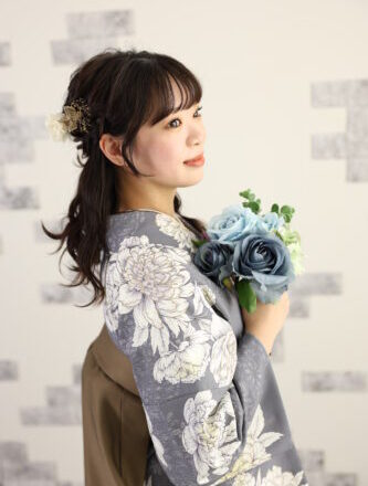 淡色くすみ系:くすみグレーに大柄×茶系の袴