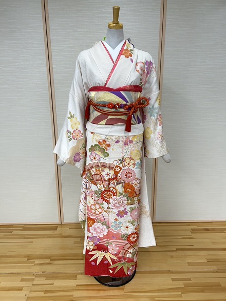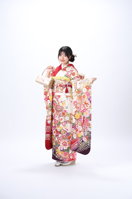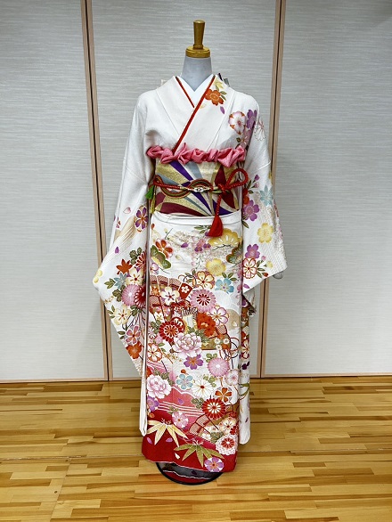 こちらは、白地に色とりどりの花模様が描かれた華やかな振袖、まるで春の庭園のような明るさと優雅さを感じさせる一着です。