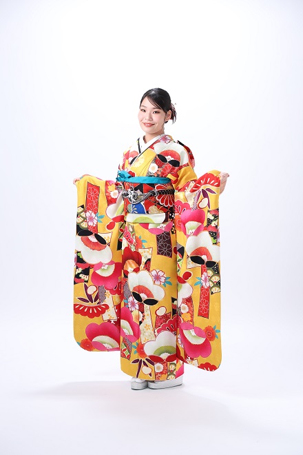 - ビビッドな黄色振袖 × 黒地に赤金の帯