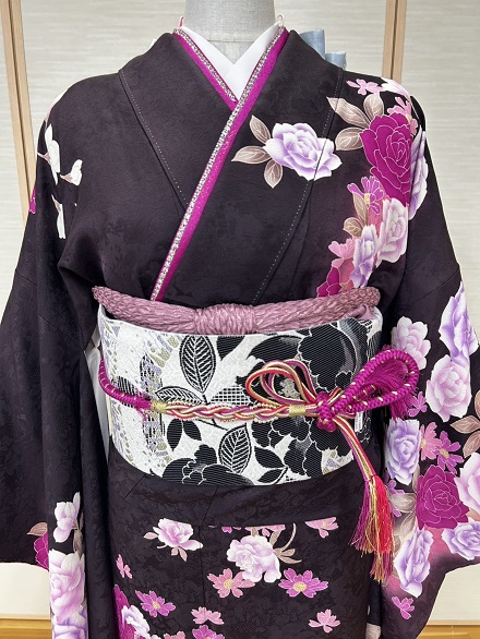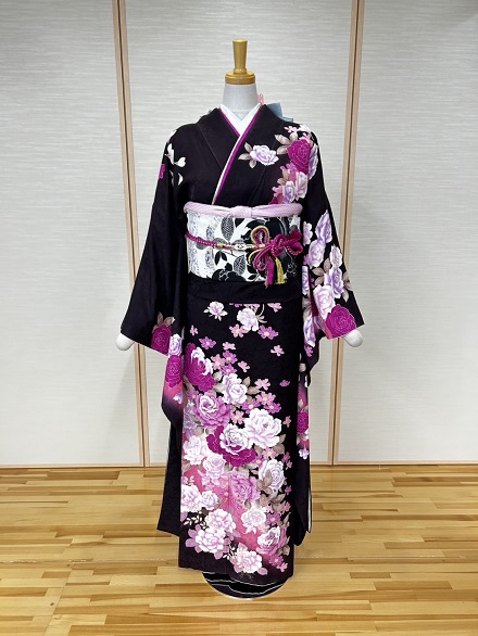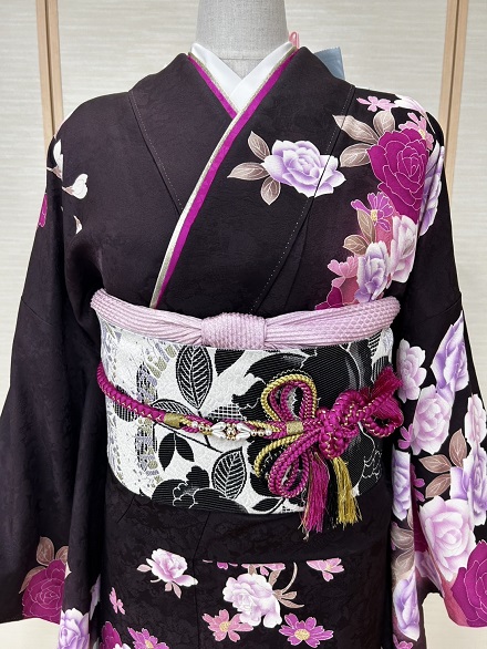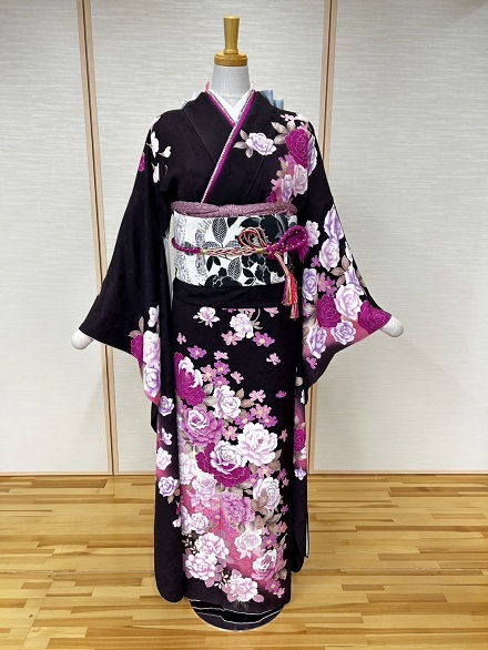 シックな黒地にバラが映える振袖も、小物の組み合わせで少し印象が変化します。