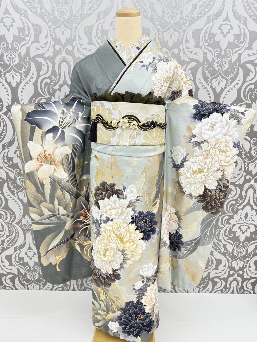 落ち着きのある淡いグレーグリーンの地色に、白・黒・金の美しい牡丹(ぼたん)や百合の柄が大胆に描かれた、大人っぽさと華やかさを兼ね備えたお振袖(ふりそで)。上品なのに地味じゃない、そして洗練されているのにしっかりと華やか。そんな絶妙なバランスで、お嬢様の魅力をぐっと引き立ててくれる一枚です。