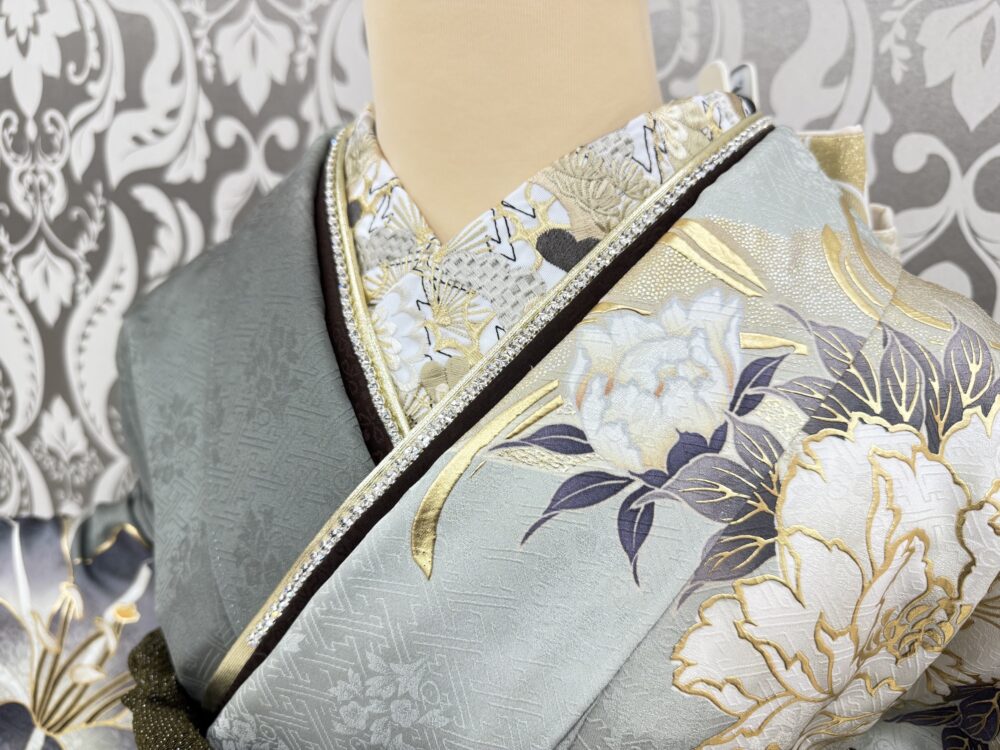 全体を通して、淡いグレーグリーンの上品さと、牡丹と百合の華やかで格調高い柄、そしてシックな小物づかいが絶妙にマッチした、大人の魅力がたっぷり詰まったコーディネートです。