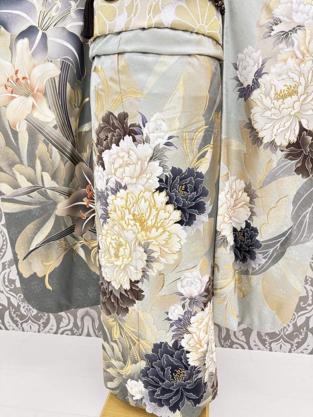 この振袖(ふりそで)をより一層華やかに見せているのが、贅沢に描かれた「牡丹」と「百合」の花です。