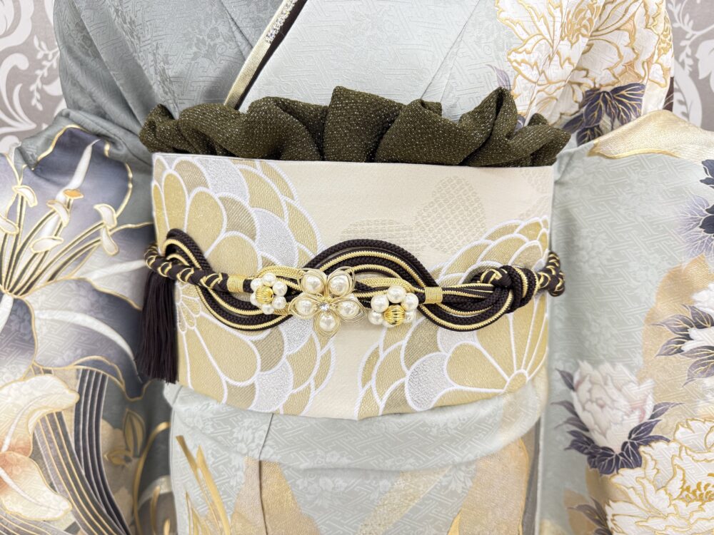 今回使用している帯締めは、茶色と金色をベースにした組紐(くみひも)タイプ。 中央にはパールとゴールドの飾りがほどこされており、まるでアクセサリーのようなきらめきが特徴です。