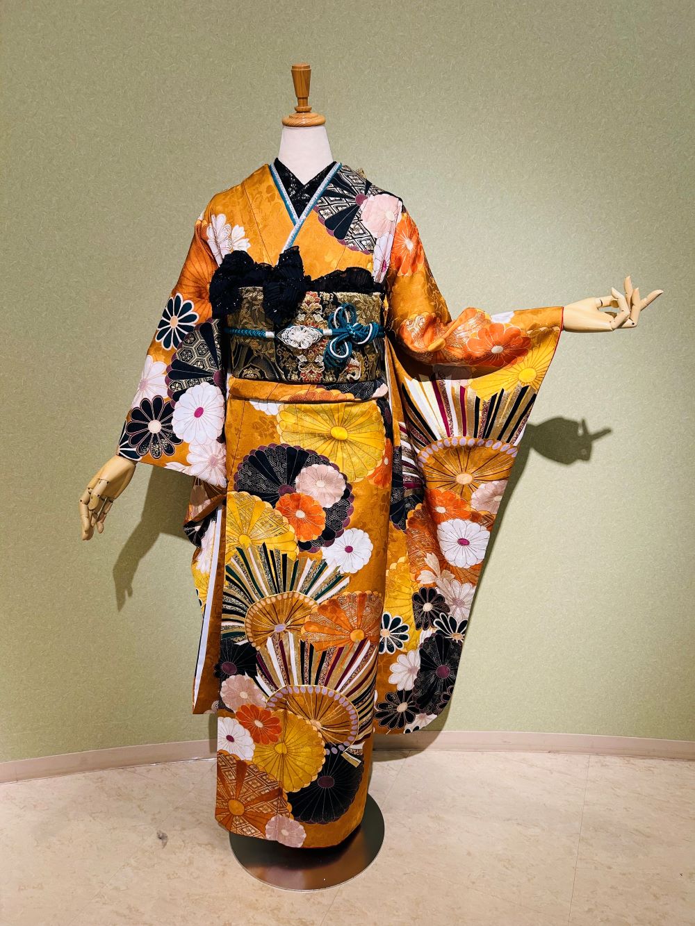 たとえば今回ご紹介している金茶色(きんちゃいろ)の振袖(ふりそで)。