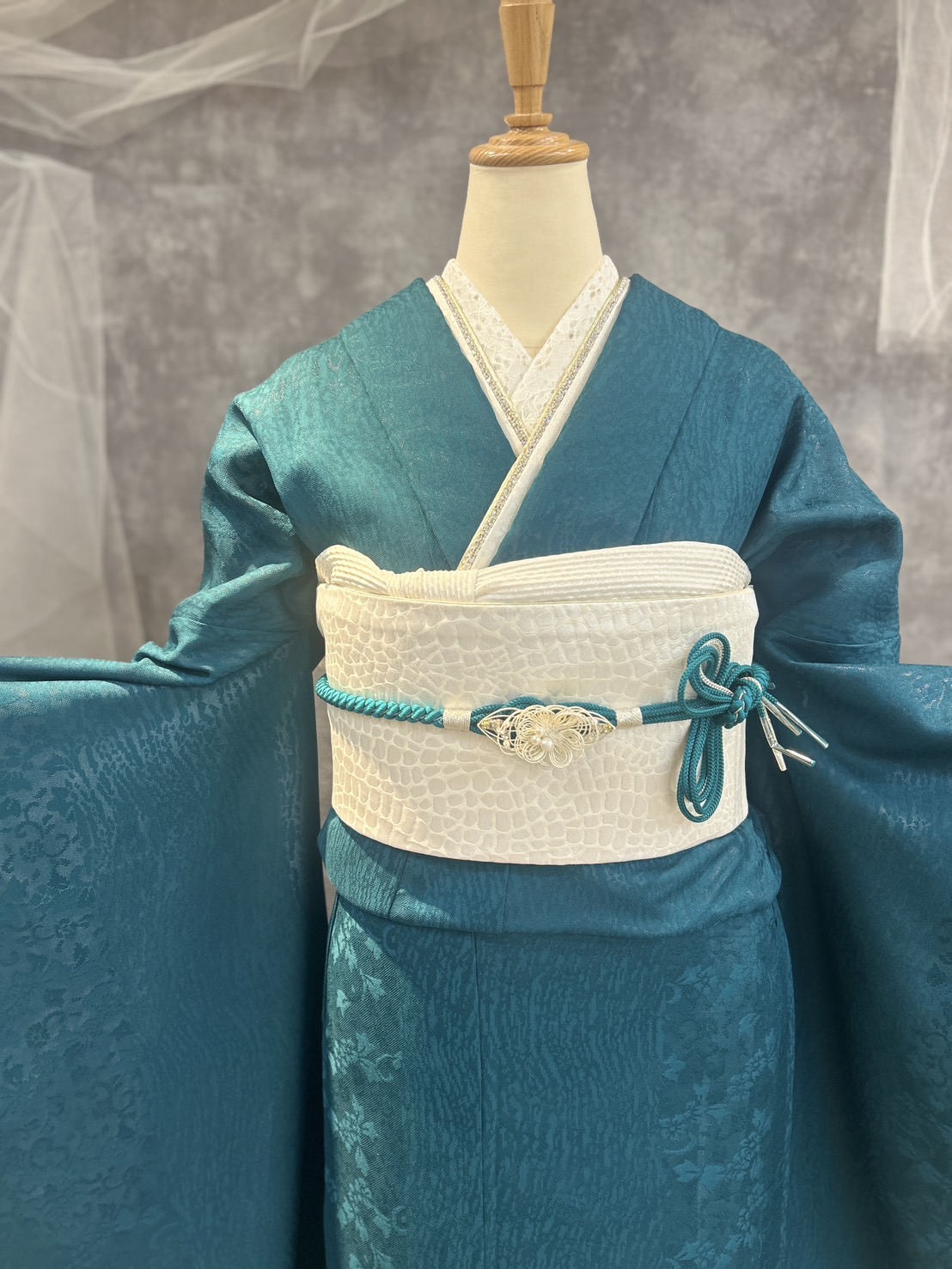 深い青緑の色が作り出す静かな華やかさ、白帯の上品な輝き、小物の統一感、レースの可憐さ。 そのすべてが調和することで、想像以上に奥行きのあるコーディネートに仕上がりました。