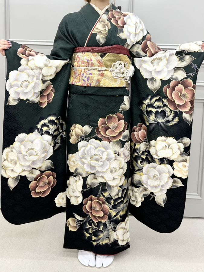 そこにあえて大きめの牡丹や椿をワントーンで描いたデザイン