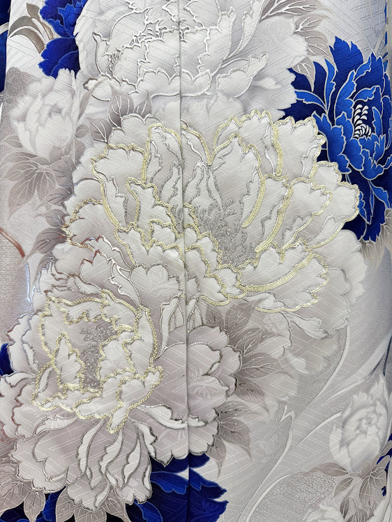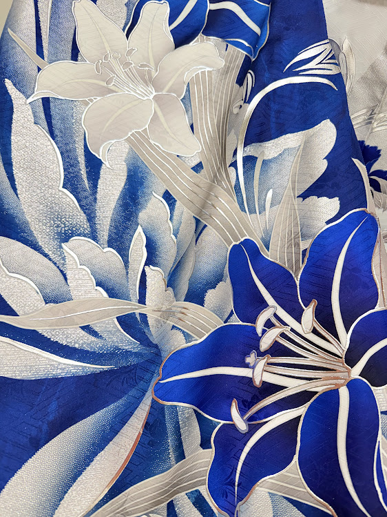 片方は大胆に描かれた大きな百合(ゆり)の花、もう片方には繊細で上品な牡丹(ぼたん)の柄。
