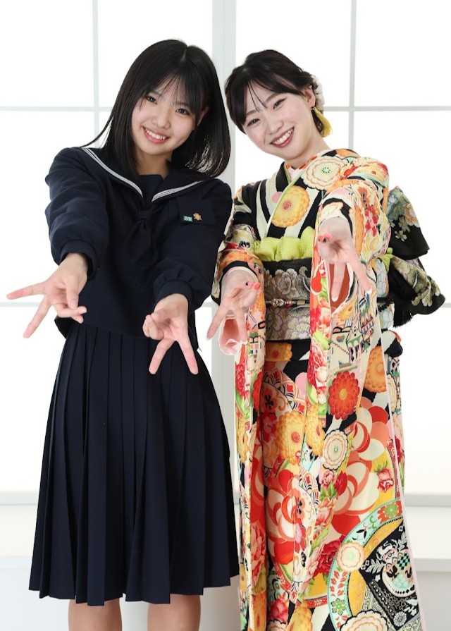 振袖(ふりそで)姿やワンピース姿・制服姿で並ぶご姉妹写真はとても華やか。