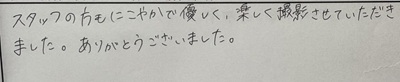 北見店 2025 北見市 2025年2月8日 「スタッフの方もにこやかで優しく、楽しく撮影させていただきました。 ありがとうございました。」 上記のコメントを頂きました。 とても嬉しいお言葉ありがとうございます! ご家族写真も皆さん笑顔が素敵でした♡ 撮影ありがとうございました😊 お客様の声へ戻る