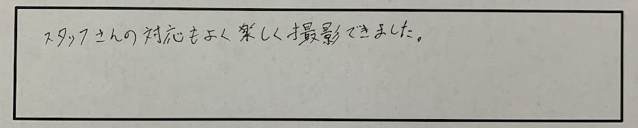 写真を撮る際もたくさん褒めてくださって楽しく撮影できました。ありがとうございました。