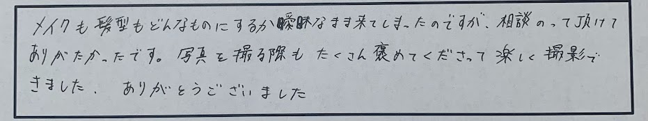 メイクも髪型もどんなものにするか曖昧なまま来てしまったのですが、相談にのって頂けて、ありがたかったです。