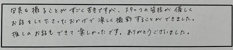 楽しく撮影をすることができました。推しのお話もできて楽しかったです。ありがとうございました。