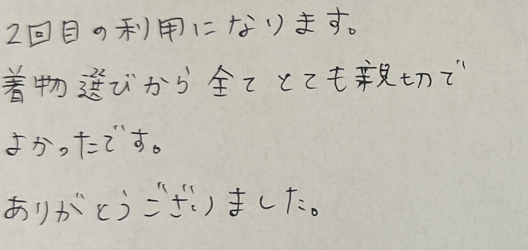 「2回目の利用になります。着物選びから全てとても親切でよかったです。ありがとうございました。」