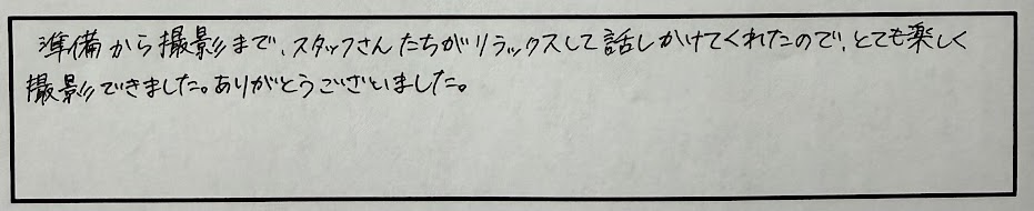 スタッフの方が、とても優しく気遣ってくれて撮影も楽しく行えました!!
