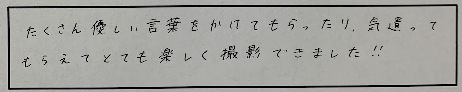 たくさん優しい言葉をかけてもらったり、気遣ってもらえてとても楽しく撮影できました!!