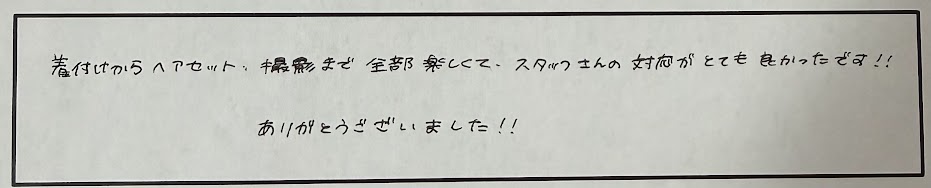 着付けからヘアセット、撮影まで全部楽しくて、スタッフさんの対応がとても良かったです!!