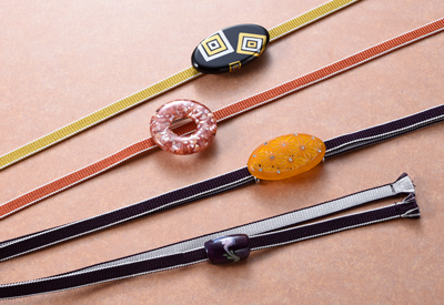 三部紐と合わせて使う帯留。素材もビーズ、ガラス、木、陶器など様々です。合わせる着物との色合わせや気分によって選択してください。小さなもので場所も取らないので、たくさんあると楽しいものです。