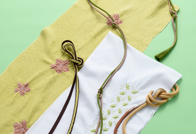 帯着物は縦ラインを強調するものですが、そのなかで帯まわり、中でも帯締は横ラインを描きます。紐だけで帯を支えるので緩まないことは必須条件です。その上で色合いや組み方など、帯締の奥の深さを堪能下さい。